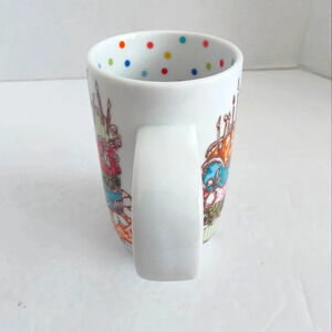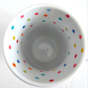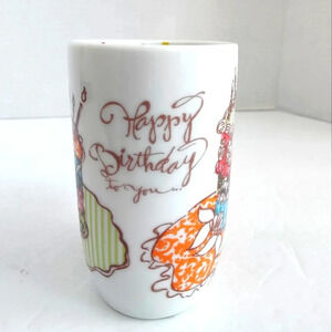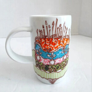 Coffee/tea cup with colorful cake graphics and "Happy Birthday To You" lettering . Multi-colored polka dots adorn the inner surface. In unused, pristine condition.