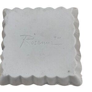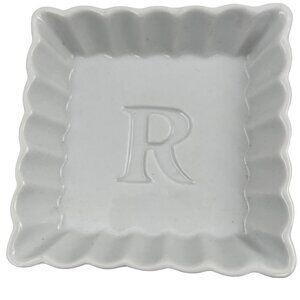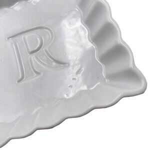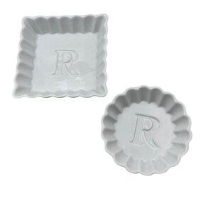 Rosanna Trinket Tray Dish Set of 2 - one square, one round, white with monogrammed letter "R", scalloped edge, ceramic, marked Rosanna™ on back.