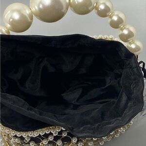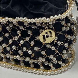 Completely handmade by expert craftsmen, this statement bag is decorated with allover imitaion pearls, topped with a sculptural handle evoking regal elegance.