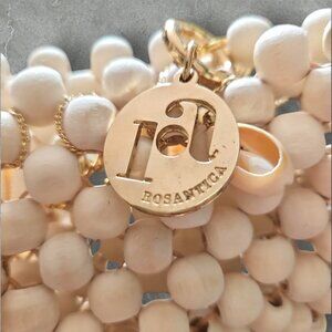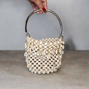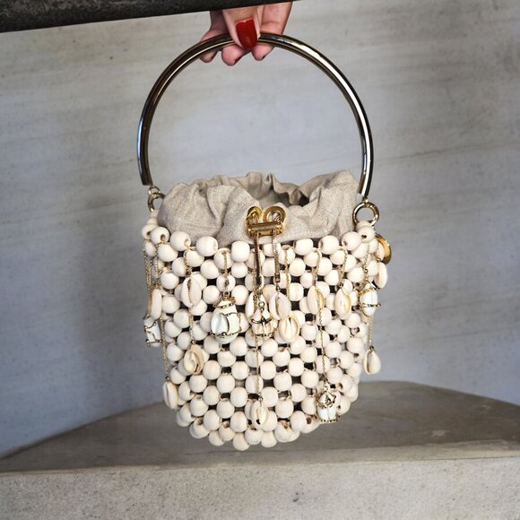 This Rosantica Beaded Bucket Bag features intricate beadwork, gold-toned hardware, and shell charms. The bag is accented with a polished handle and a drawstring linen interior.