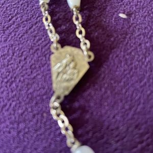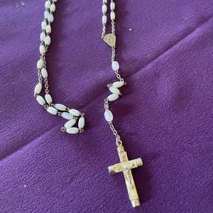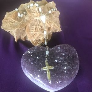 This is a vintage mother of pearl Rosary the center is the Miraculous Sacred Heart of Jesus. The medallion shows some patina from age.This a Beautiful Rosary .