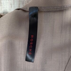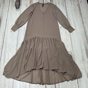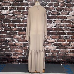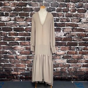 Rosche Dress Tan Maxi Long Sleeves V-Neck Pleated Semi Sheer Size Large Brown
