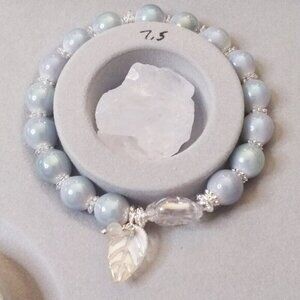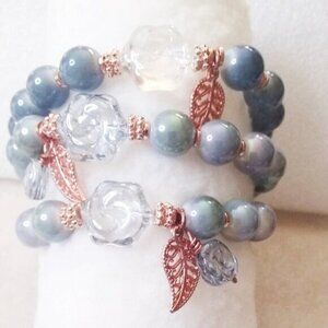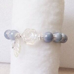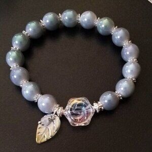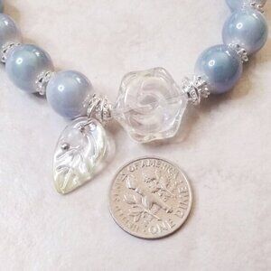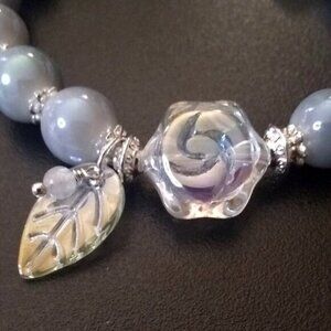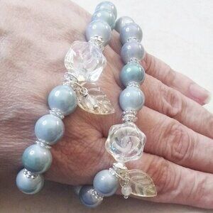 Fall in love with the soft shimmer of this handmade beauty. Pale blue‑gray iridescent beads catch the light with a dreamy glow, while a large Czech glass rose blossom and a matching glass leaf, whisper of romance and timeless femininity.