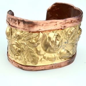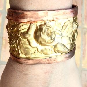Thank you for looking at this hand-forged solid copper cuff, wrapped with radiant repoussé floral brass.