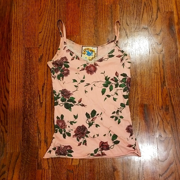 This top has an American Traditional rose tattoo print throughout. The light pink base and lace neck detail balance out tough and sweet.