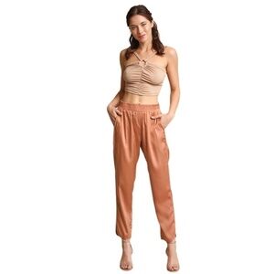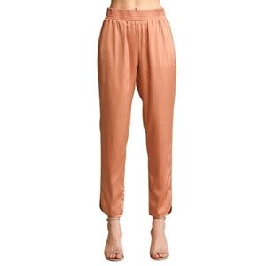 Designed for all-day comfort with an elastic waistband and sleek side pockets, these pants are your go-to for a casual daytime outing or a night out. The satin finish and side-binding detail add a touch of sophistication, giving you an effortlessly polished look.