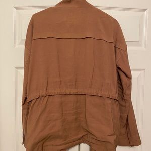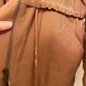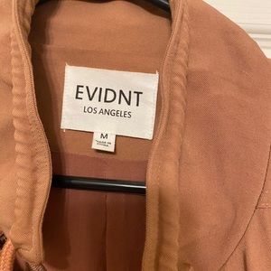 Evident LA jacket. Great fit, working zipper and pockets. Beautiful color, perfect warmth for an overcast Spring or Fall day. Slit in the sleeves. Size M. Small bleach stain on drawstring and an oil stain on right shoulder— see pics.