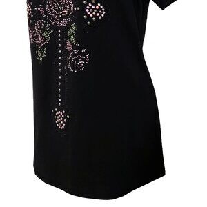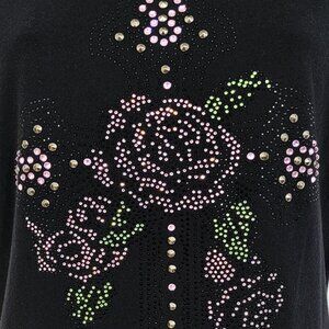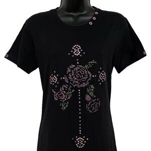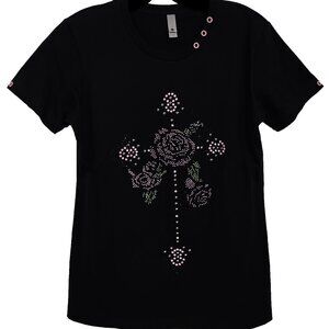 Inspirational, Beautiful decorated Rose Cross motif design, hotfix Crystals and Studs on women's black crew neck tee, enhanced with pink eyelets on neckline and sleeves, heavenly creative.
