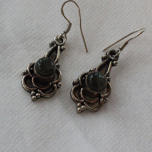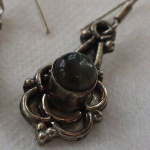 These timeless metal dangle earrings feature a classic, antique design. Perfect for more formal outfits and special events! Features a large gray stone.