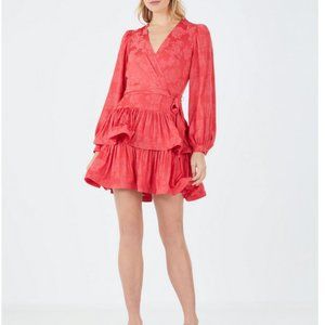 Feminine dress topped with a plunging V-neck and long puff sleeves. Designed with a flattering waist tie. Finished with romantic tiered ruffles at the skirt.
