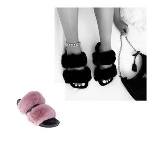 Super Cute Rose-Colored Faux Fur Sandals. Features a double strap and rubber sole. Perfect for casual days or laid-back nights!