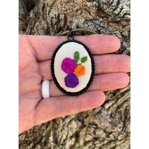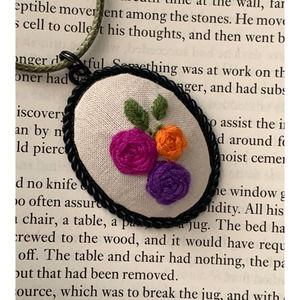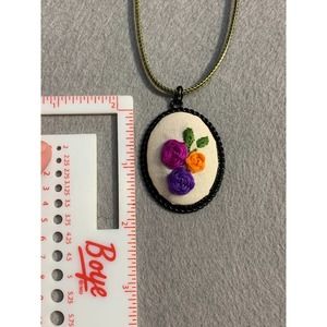 This necklace features purple, fuchsia and orange roses stitched on fabric and set in a black enamel metal alloy bezel. The cabochon measures 30x40mm; Pendant measures 34x47mm.