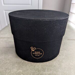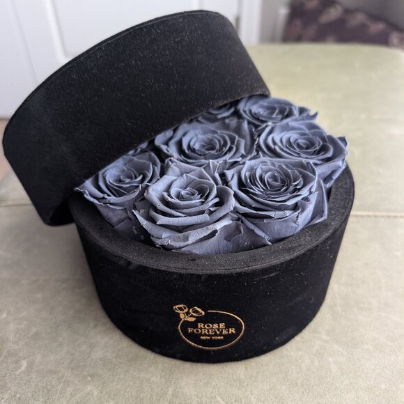 9 Dark Grey/Blue Roses in a round black velvet box with lid. Preserved Real Roses from Rose Forever company in New York. Beautiful accent that lasts for years with zero care, no watering.
