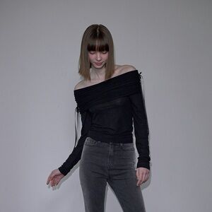 WConcept Rose Frantz ribbon off-the-shoulder top in black.