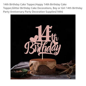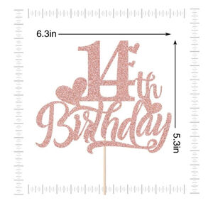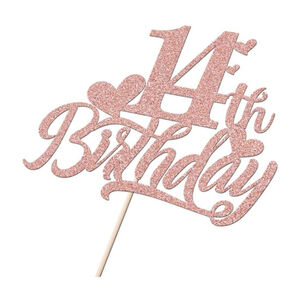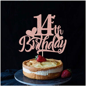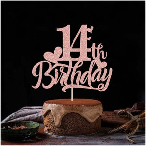 New with tags, this rose gold glitter cardstock 14th birthday cake topper features the number 14, the word 'Birthday', and two small hearts. It measures 6.3 inches in height and 5.3 inches in width. The topper is attached to a wooden stick for easy insertion into a cake. The material appears to be sturdy cardstock with glitter applied. No visible imperfections are present. The design is suitable for a 14th birthday celebration. Brand and model information are not available.
