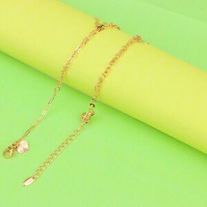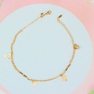 Elegant rose gold anklet featuring charming accents including a music note, floral, and butterfly motifs. Crafted in high quality brass with gold plating and a glossy finish.