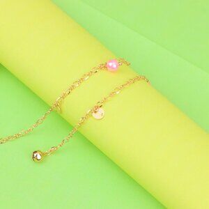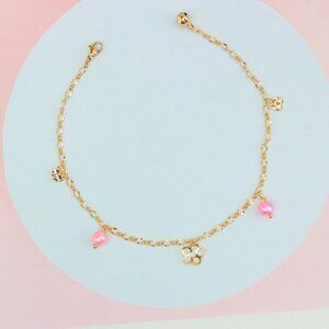 Brighten your ankle with this rose gold anklet featuring adorable pink beads, floral charm, and shimmering disc details.