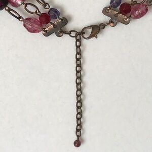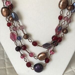 Pretty pinks, gold and gray beads on a rose goldtone chain adorn this three-strand necklace. About 18" with 3" extender, lobster claw clasp.