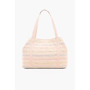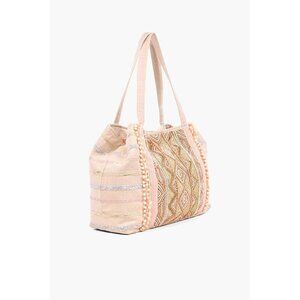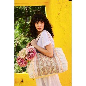 Dare to tote in style with this multi-purpose bag! Hand-beaded in the front and accented with pompom lace, it features double shoulder straps and elegant lace details. Crafted from hand-woven jacquard, it also boasts a magnetic button closure and lined interiors with zip pockets and organizers. Color: pink. One size. 70% Cotton, 20% Polyester, 10% Lurex. Do not wash.