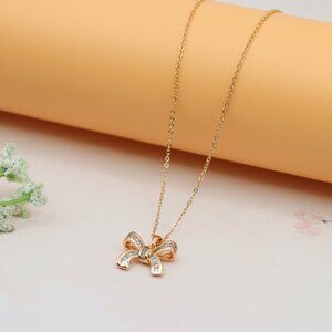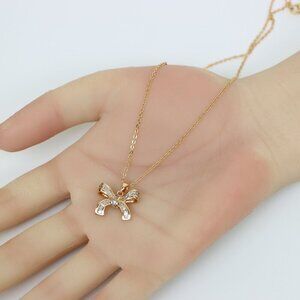 Charming rose gold bow necklace with crystal details for a dainty touch.