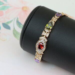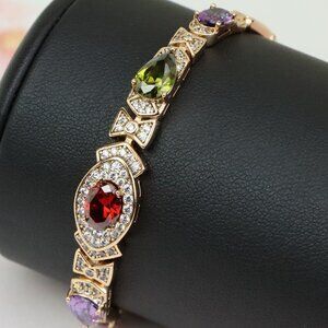 Elegant rose gold bracelet adorned with sparkling multicolor stones and a diamond halo design for a luxurious look. Perfect for special occasions or as a standout everyday accessory.