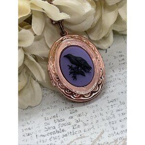 Rose Gold Brass Raven Purple Black Crow Locket Necklace Pendant Gothic Wedding