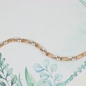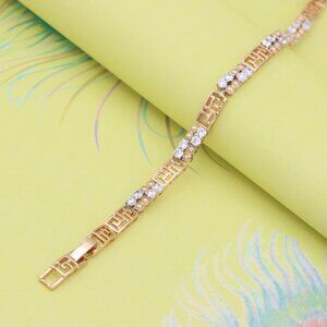 This bracelet blends shimmering cubic zirconia stones with intricate Greek key links, offering a bold fusion of sparkle and structure. Crafted from gold-plated high-quality brass.