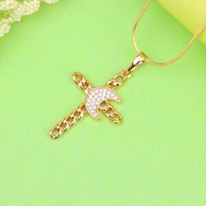 Stylish and symbolic pendant featuring a chain cross design with a crescent centerpiece.