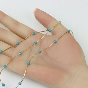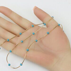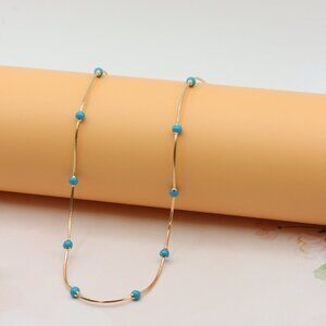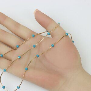 Delicately crafted rose gold necklace featuring bright blue beads for a pop of color and charm. A must-have accessory for a modern, elegant look.