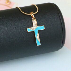 Striking cross pendant featuring aqua enamel and radiant crystal accents.