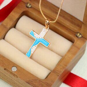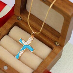 "Rose Gold Cross Pendant with Aqua Enamel and Sparkling Stones, XPPT1508