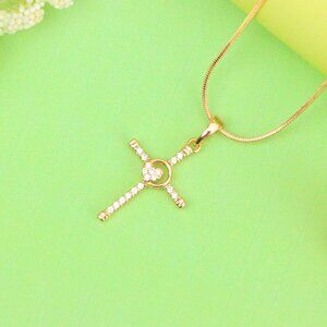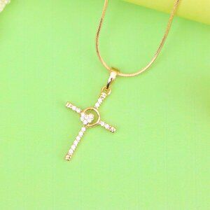 This modern cross pendant features a heart-shaped center detail, beautifully adorned with shimmering stones and finished in gold plating over high-quality brass.