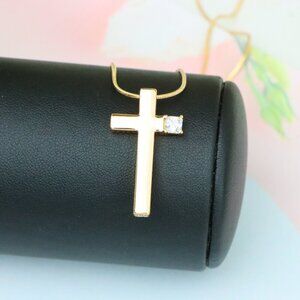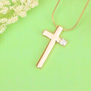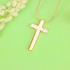 Sleek and modern rose gold cross pendant featuring a single square-cut crystal, blending faith and elegance in a minimalist design.