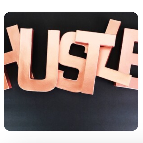 Rose gold block letters that spell out HUSTLE. Great condition and perfect for an office. There are beads inside that prevent the letters from tipping over.