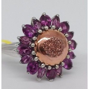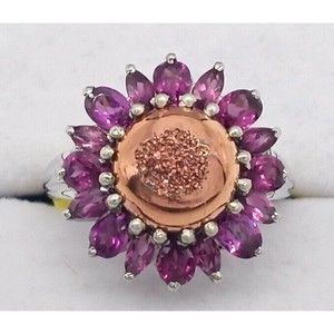 This lovely designer ring was found at an estate sale. It is made of 925 sterling silver and is stamped inside the band. The ring has a round shaped rose gold stone with Druzy crystals. It is also accented with prong set pink gemstones which are marquise shaped. The ring measures approximately 1" high x .84" wide x .74" deep and weighs 4.38 grams. It is a size 7. Please note that there is a tiny spot with loss of rose gold finish on the ring (please see all photos and videos), but the ring is still in good condition and is new with tag. The tag says, "Made in India". This beautiful ring has lots of sparkle and is very unique. It would be a great addition to your jewelry collection.