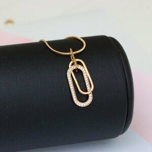 Stylish and modern pendant featuring two linked oval loops, one accented with crystals.