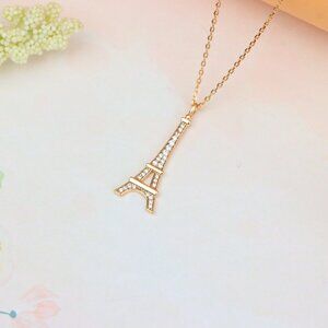 Elegant rose gold necklace featuring a crystal-studded Eiffel Tower pendant, perfect for adding Parisian charm to any outfit.