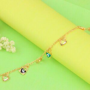 "Rose Gold Evil Eye & Heart Charm Anklet in Gold Plated Brass, XPAL1193