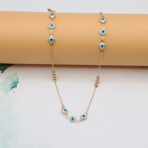 Stylish and symbolic necklace featuring blue evil eye charms and gold beads, perfect for layering or wearing solo.