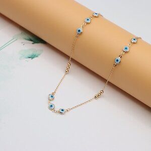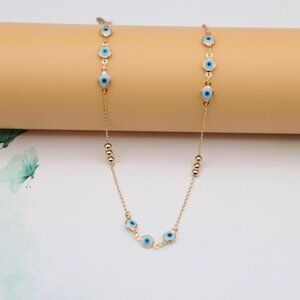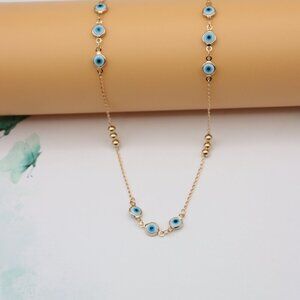 Stylish and symbolic necklace featuring blue evil eye charms and gold beads, perfect for layering or wearing solo.