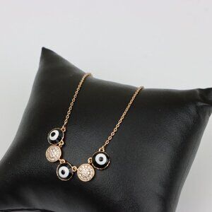 Stylish and elegant rose gold necklace with a triple evil eye charm design and sparkling accents.