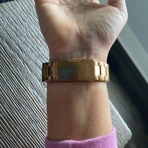 @michealsknidns9 Hi! Yes still available! A lot of your questions are in the description ☺️ it’s stainless steel! Its gently used, pictures show the “wear” on the wrist where you rest it, but that’s it!