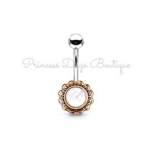 Rose Gold Filigree Flower with White Opal Glitter Center Belly Button Ring