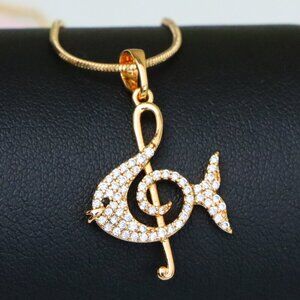 Charming rose gold fish-shaped pendant featuring a treble clef design encrusted with sparkling crystals—perfect for music and ocean lovers alike.