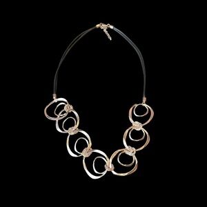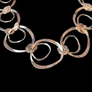 Rose gold geometric links linked together with rose gold imprinted disks and a corded piece that completes the necklace with a rose gold lobster claw closure. I do not know the brand of this necklace. This is in great preloved condition. It’s a true statement piece that is perfect for this year’s statement pieces trend! Length is 15” without the 2 3/4” extender and each shape is aprox 2”x 1 3/4” There are 7 geometric links. NWOT