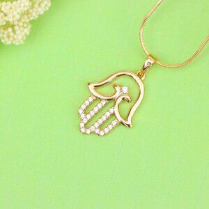 Elegant open-design Hamsa pendant in rose gold with shimmering stones. Crafted in gold-plated high quality brass for a blend of symbolism and style.