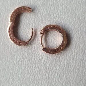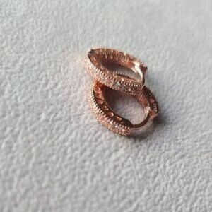 Elegant rose gold hoop earrings adorned with sparkling stones and heart details. Perfect for adding a touch of romance to any outfit.