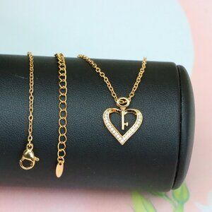 Romantic rose gold necklace with a heart-shaped pendant and delicate key charm, outlined with shimmering stones for a timeless finish.