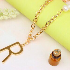 Elegant and chic rose gold necklace featuring a bold 'R' initial and a unique pearl accent. Perfect for adding a personalized touch to any outfit.