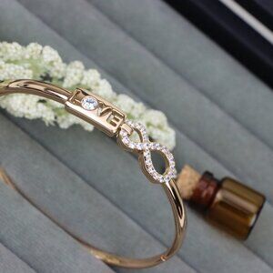 Elegant and symbolic, this rose gold bangle features a charming ""LOVE"" and infinity design adorned with sparkling stones. Perfect for daily wear or gifting to someone special.